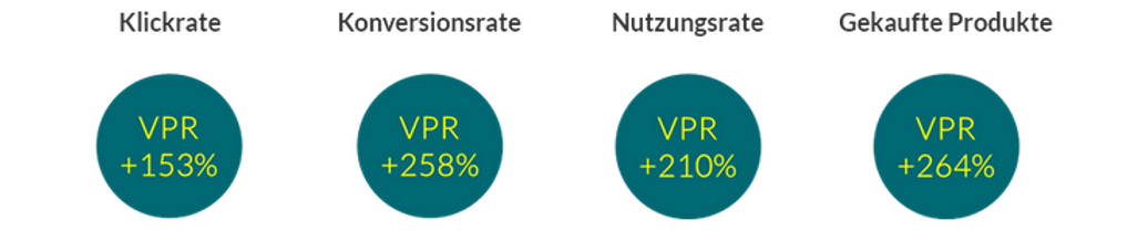 In addition to comparing two different recommendation solutions, the test basically confirmed that product recommendations support customers in their shopping process and lead to more purchased products. In our test, the visibility of Visual Product Recommendations was low and yet over 12% of visitors clicked on the recommendations, subsequently purchasing significantly more products (+264%).